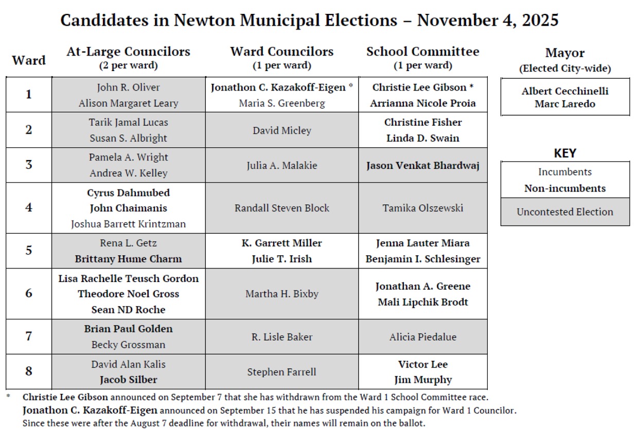 Here is information for voters regarding Newton’s November 4, 2025 municipal election: Candidate and their websites, candidate forums and interviews, a ballot question, and voting methods and hours. Some information is not yet available. Fig City News will update this guide as new information becomes available.