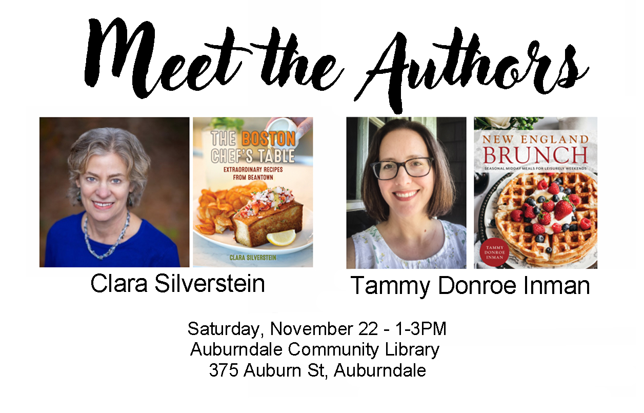 Looking for last-minute Thanksgiving recipes or early holiday gifts? Stop by Auburndale Community Library on Saturday, November 22 anytime between 1 and 3PM to meet Clara Silverstein and fellow Globe Pequot Press cookbook author Tammy Donroe Inman. Chat about cooking and take a look at our books!