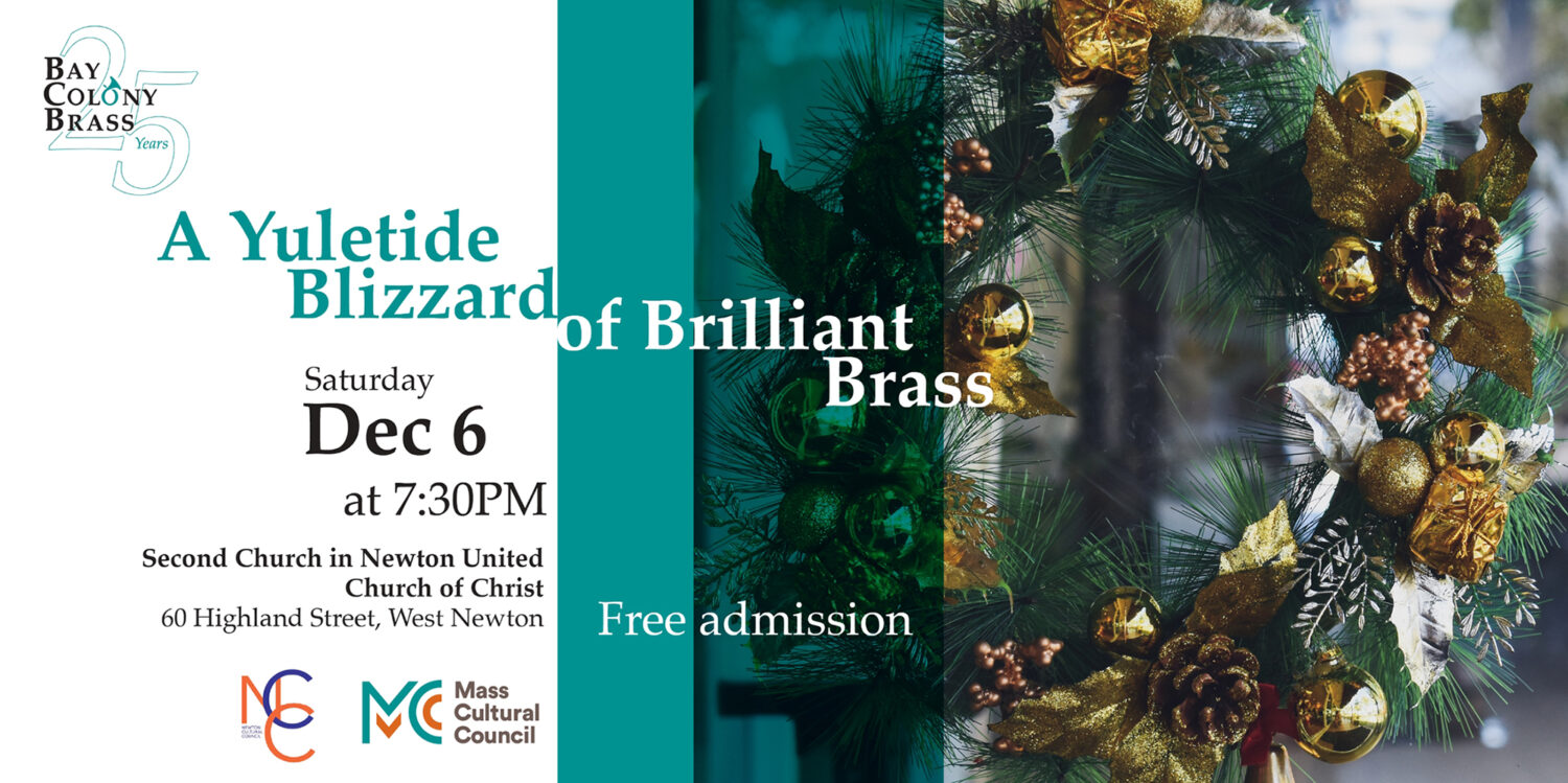 Music director Philip Sanborn leads Newton’s 20-member Bay Colony Brass in “A Yuletide Blizzard of Brilliant Brass” on Saturday, December 6 at 7:30PM at Second Church in Newton (60 Highland Street, West Newton). This free, family-friendly concert of Christmas favorites ranges from Leroy Anderson’s “A Christmas Festival” to modern arrangements of traditional carols and “Christmas Toons” by Emmy Award-winning composer Anthony DiLorenzo. The concert features an audience sing-along. This program is supported in part by a grant from the Newton Cultural Council, a local council supported by the Mass Cultural Council and the City of Newton.