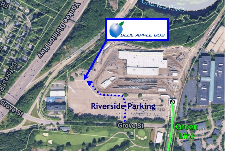Blue Apple’s pickup and drop-off location at Riverside is a new bus stop in the far back-left of the Riverside parking lot – not by the brick MBTA building that used to be a bus terminal.