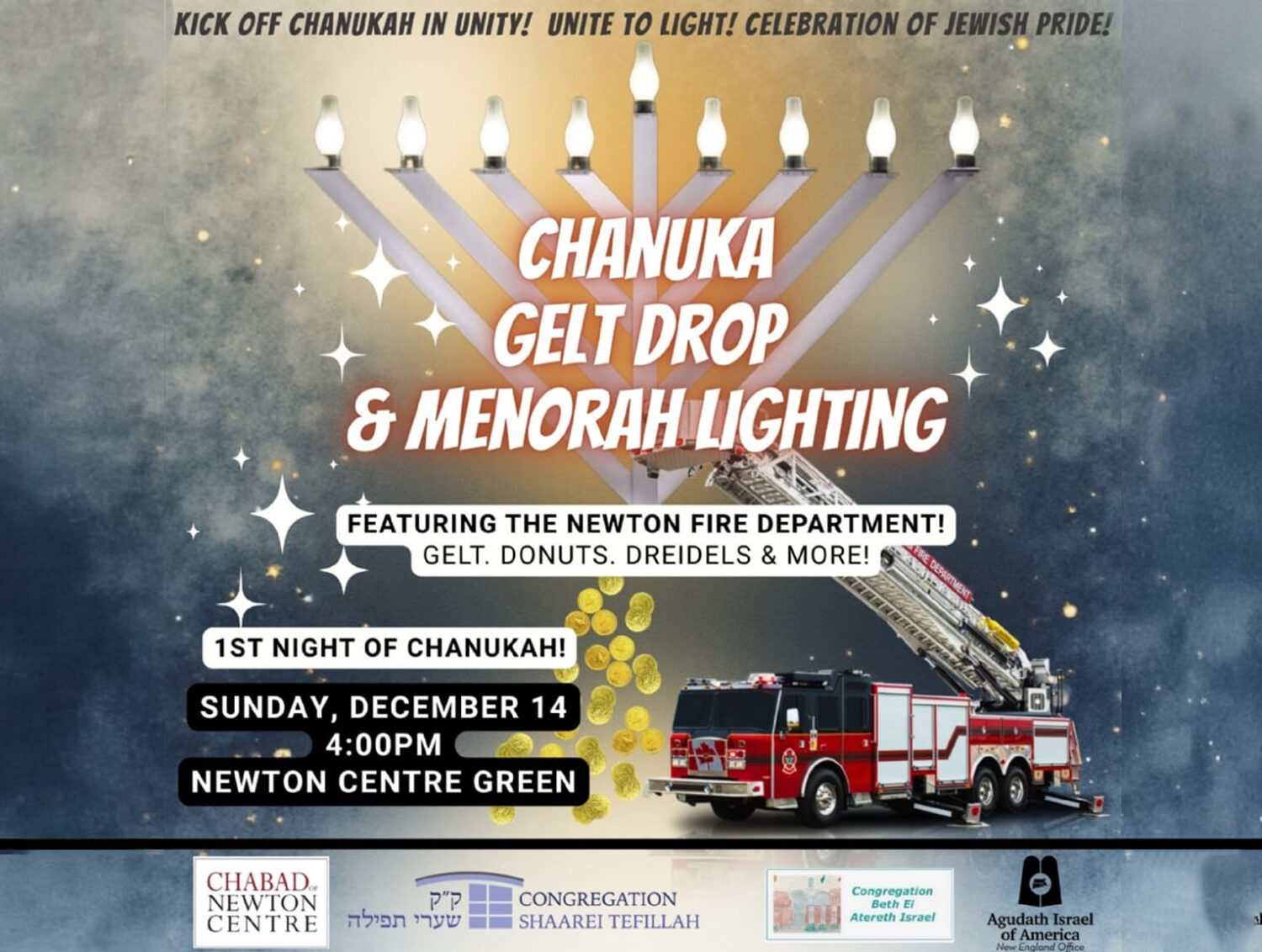 Join Chabad of Newton Centre for Showing Up and Unite to Light – Chunaka Gelt Drop and Menorah lighting on the Newton Centre Green at 4PM on the first night of Chanuka – Sunday, December 14. Featuring the Newton Fire Department’s Gelt Drop!