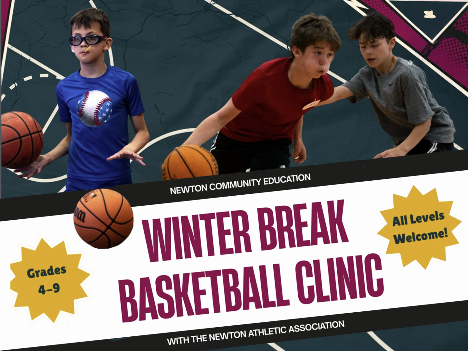 Keep your athlete active over winter break at the Newton Athletic Association Basketball Clinic, Monday, December 29 – Friday, January 2 from 9AM – 3PM at the Brown Middle School (125 Meadowbrook Rd, Newton Centre).