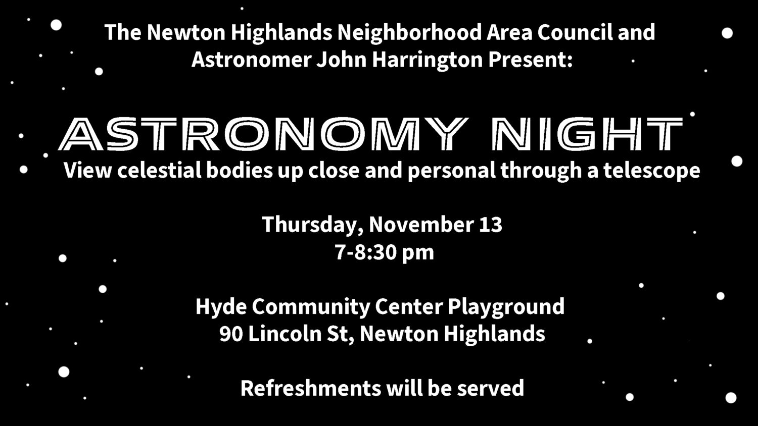 The Newton Highlands Neighborhood Area Council has had to CANCEL its Astronomy Night on Friday, November 14 from 7-8:30PM (moved from Thursday, November 13 due to weather). View celestial bodies up close and personal with astronomer John Harrington. Refreshments will be served.