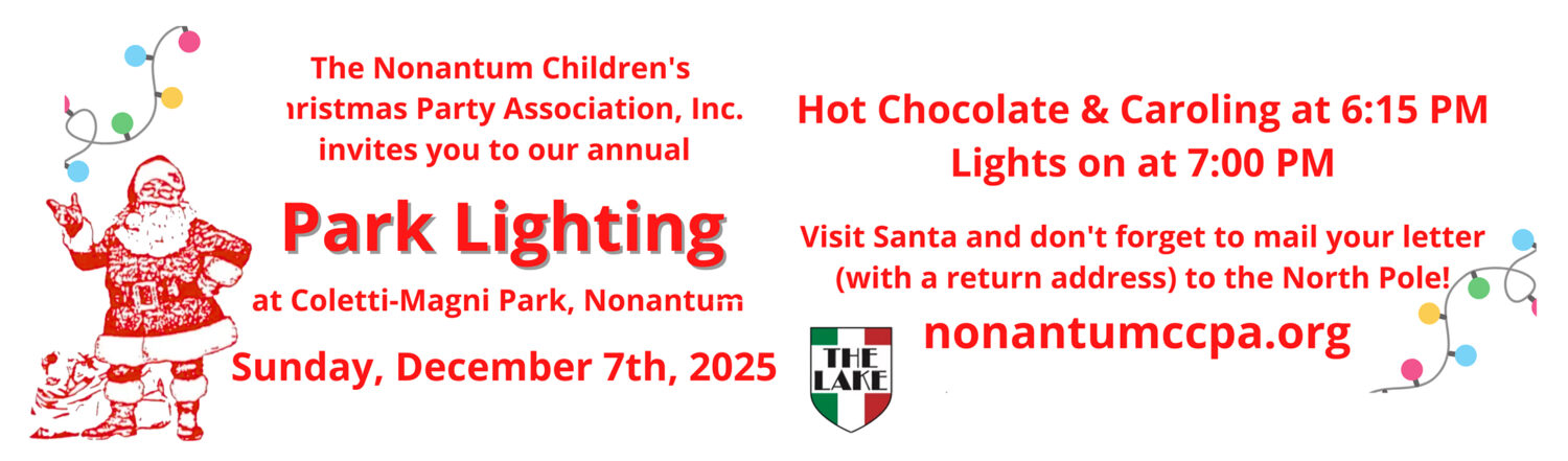 The Nonantum’s Children’s Christmas Party Association will be holding their annual Park Lighting at Coletti-Magni Park on Sunday, December 7 starting at 6:15PM with hot chocolate and caroling. Santa will arrive with friends from the North Pole and be available for photos just after the lights go on at 7:00! Bring your letter to Santa’s mailbox and don’t forget a return address!
