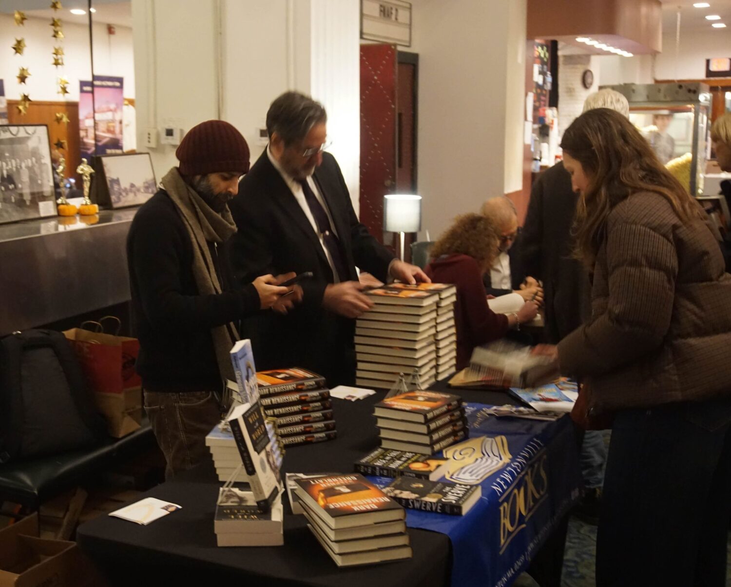 As the audience left the theater, attendees stopped at a table where Greenblatt signed copies of his books Will in the World and Dark Renaissance.