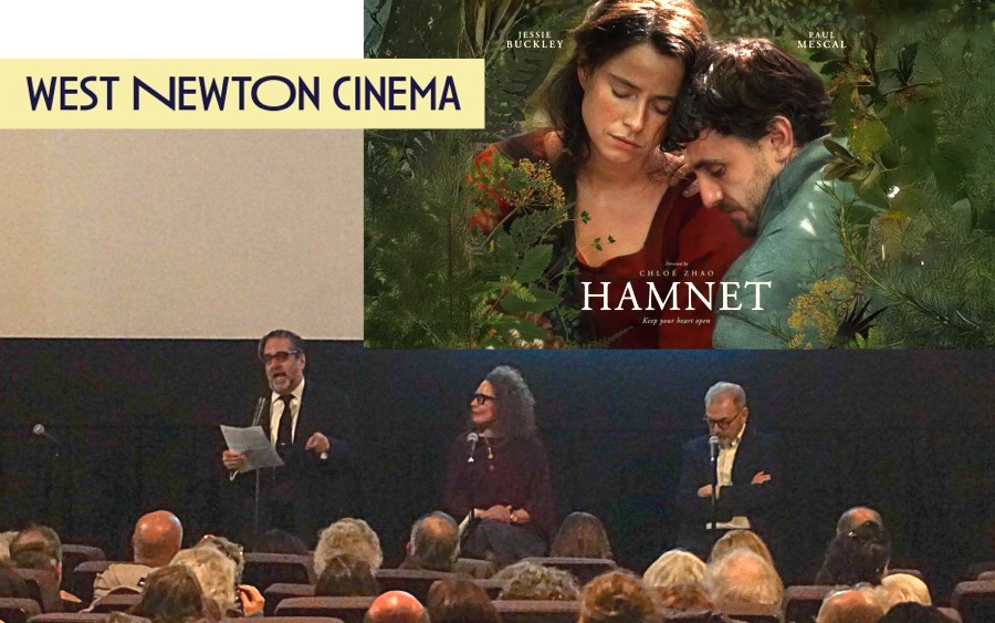 Moviegoers packed West Newton Cinema to watch Hamnet, a reimagining of William Shakespeare and his wife Agnes as they confront the love and loss that inspired Hamlet. Shakespeare scholar Michelle Ephraim sat down with historian, writer, and Newton native Stephen Greenblatt to unpack the film and its place within modern Shakespeare storytelling as part of a collaboration between the Cinema and Newtonville Books.