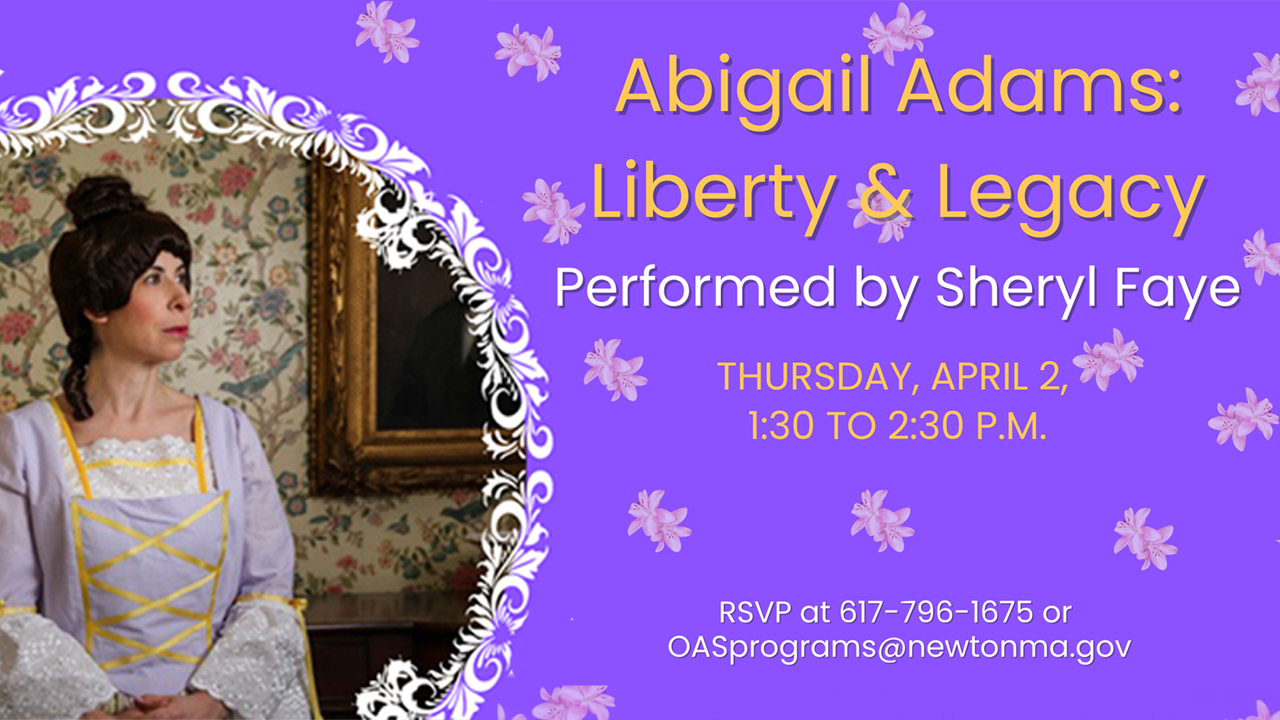 Actress Sheryl Faye will portray Abigail Adams at the Cooper Center (345 Walnut Street, Newtonville) on Thursday, April 2 at 1:30PM.