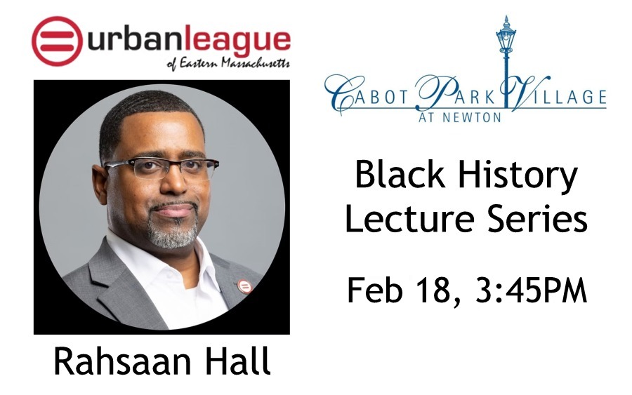 [New date and time] Rahsaan Hall, President & CEO of the Urban League of Eastern Massachusetts (ULEM), will speak in Cabot Park Village’s Black History Lecture Series on Wednesday, February 18 at 3:45PM in the Community Room of Cabot Park Village (280 Newtonville Avenue, Newtonville).