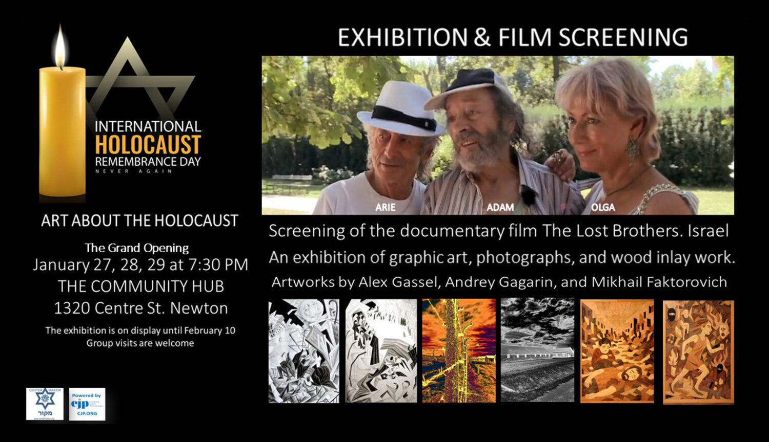 Center Makor presents Art about the Holocaust at their Community Hub (1320 Centre St, Newton) from January 27-29. The show includes the screening of the documentary film The Lost Brothers, Israel along with an exhibition of graphic art, photographs, and wood inlay work. The schedule is as follows: