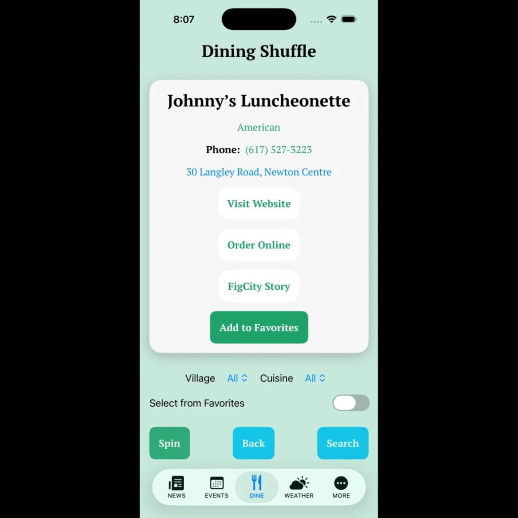The Dine tab lets you access the Fig City News Newton Restaurant Directory, which includes 160 restaurants — up from 126 at launch two years ago — with the same features readers loved: Filter by village, cuisine, or your favorites. Search by name, or tap “Spin” for a random suggestion. New: sort by distance to find what’s closest to your location.