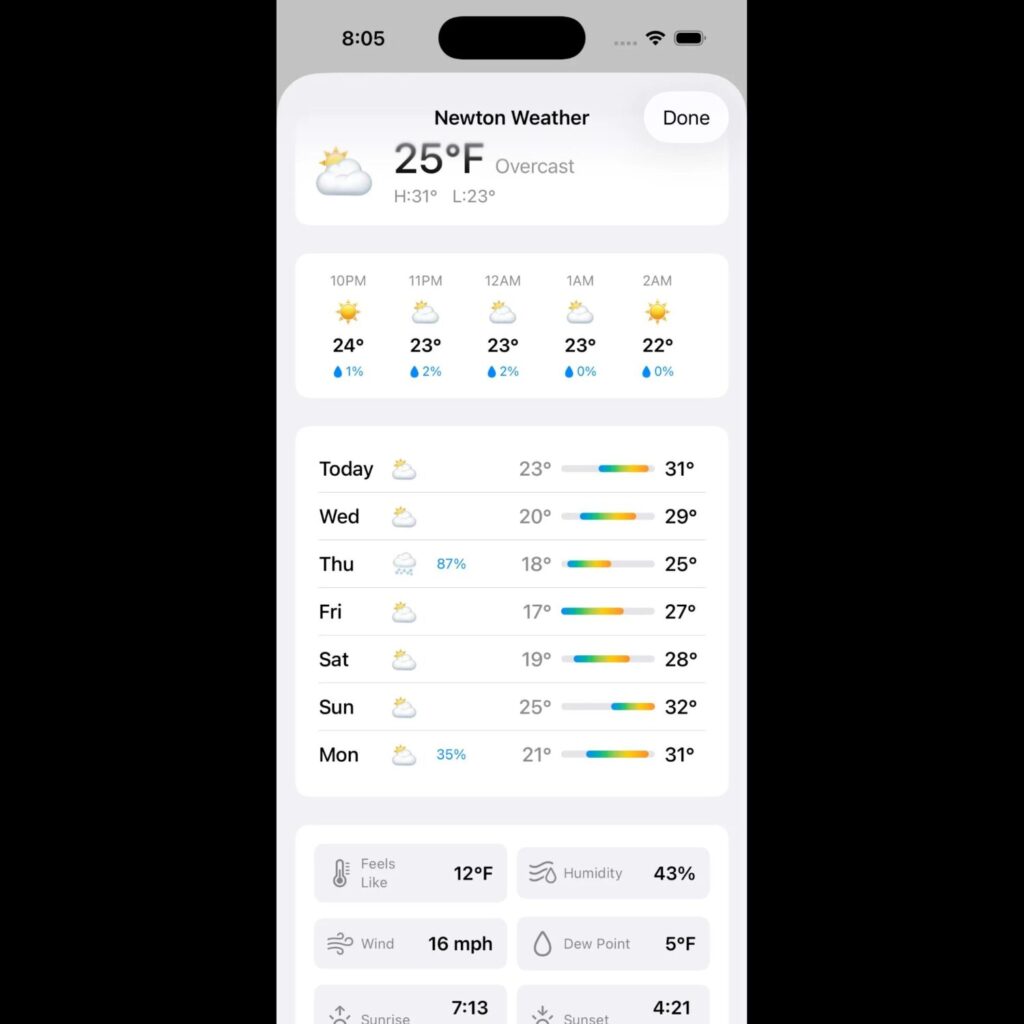 Tap the weather icon in the News tab or weather at top-left corner to get hourly and 7-day forecasts for Newton — with no ads, no upsells, and no scrolling past radar maps you didn’t ask for. Just the forecast. Or add the Newton Weather widget to your home screen and check conditions without opening the app.