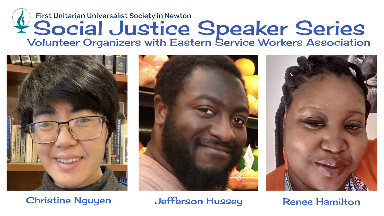 The First Unitarian Universalist Society of Newton’s (FUUSN) Social Justice Speakers Task Force is holding a discussion with Christine Nguyen, Jefferson Hussey, and Renee Hamilton, volunteer organizers with the Eastern Service Workers Association (ESWA), on Sunday, February 22 at 12PM in the FUUSN Alliance Room (1326 Washington Street, West Newton).