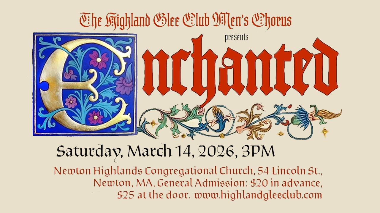 On Saturday March 14, at 3PM at the Newton Highlands Congretional Church (54 Lincoln St, Newton Highlands), the Highland Glee Club Men’s Chorus and Music Director Sarah Robinson Seeber present Enchanted, an exploration of the mists, mysteries, and mysticism of medieval and renaissance times, via chant and chant-inspired music.