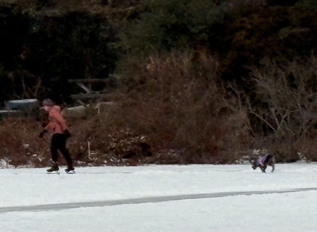 On Monday, January 5, recreational hockey enthusiasts, those struggling to find balance, and even a few four-legged cold-weather fans enjoyed a rare day on the ice at Auburndale Cove, the only authorized outdoor skating area in Newton.