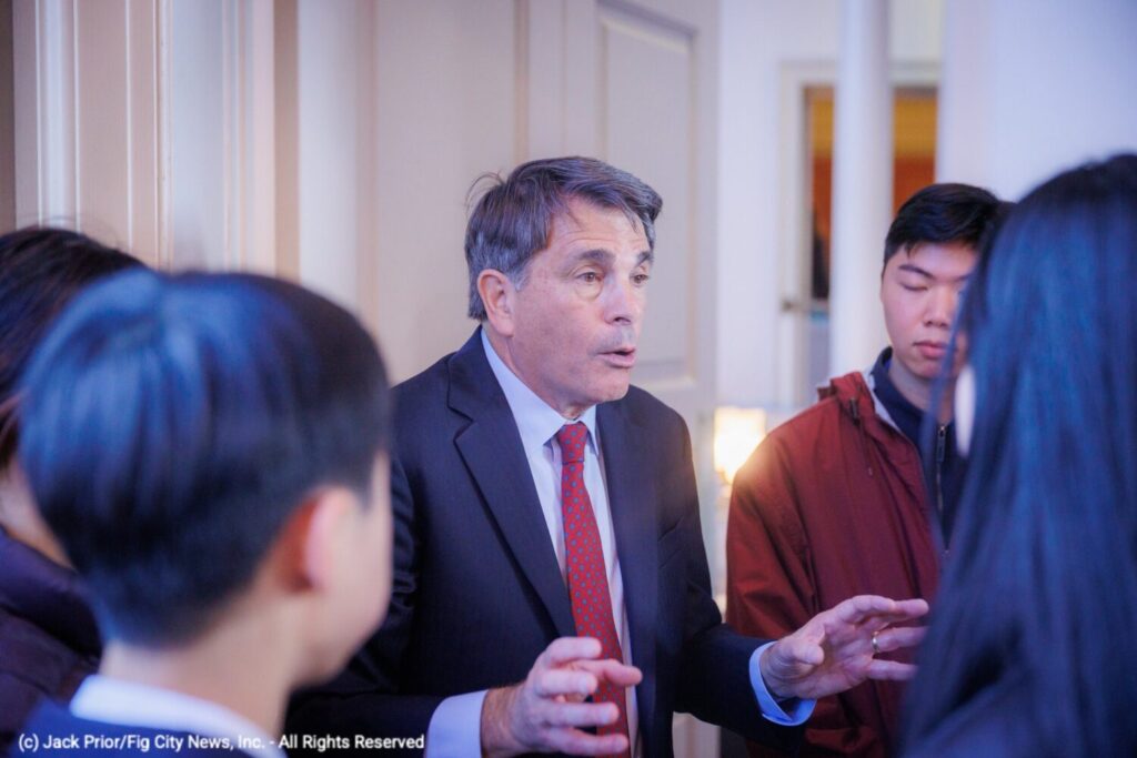 Mayor Marc Laredo speaks with Newton Chinese Language School students Jiarong, Lucas, Brian, and Jiayi (photo: Jack Prior)