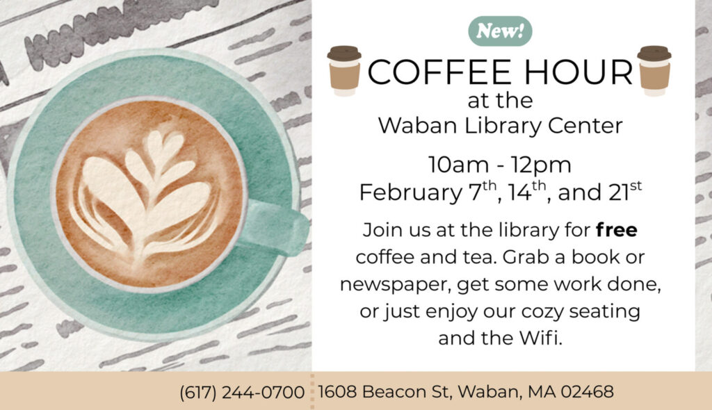 Come to Coffee Hour at Waban Library Center (1608 Beacon St, Waban – right near the T stop) on Saturdays in February (7th, 14th, and 21st) from 10AM-12 PM! Join us to get cozy with a book or newspaper, chat with your community, or to get some work done. Coffee…