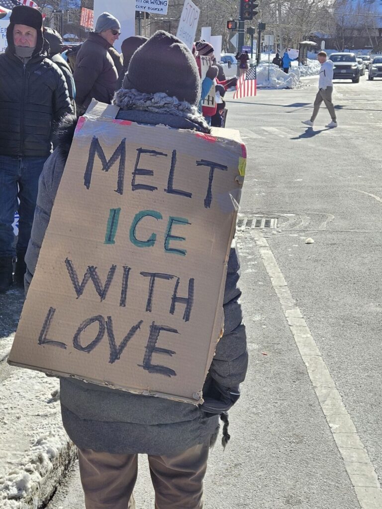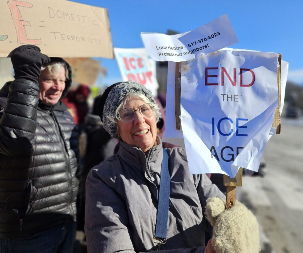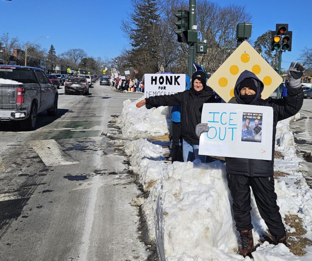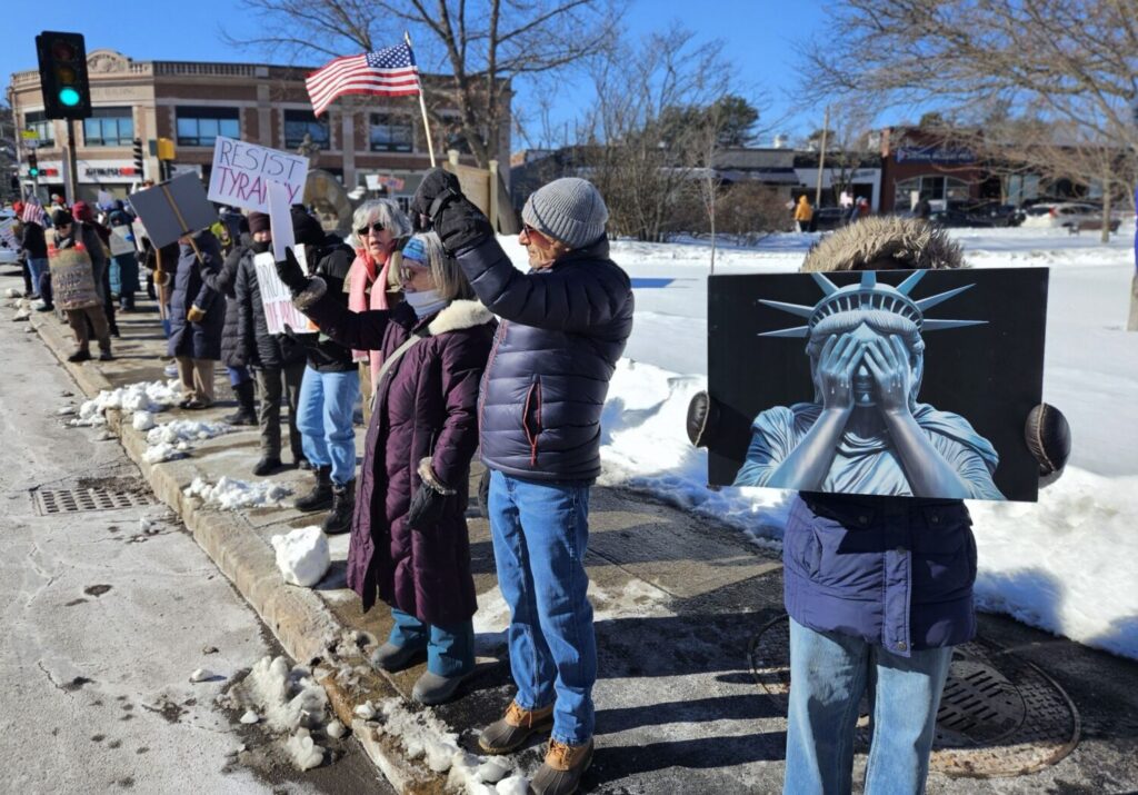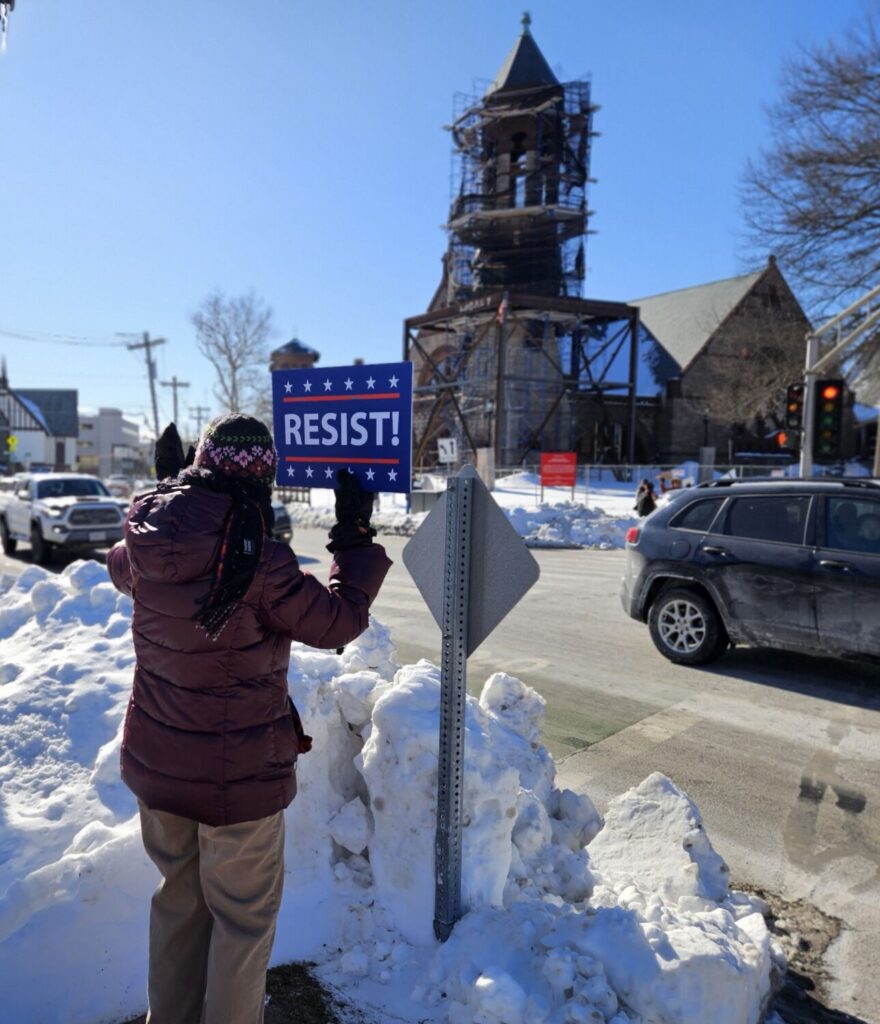 At noon on Saturday, January 31, despite 14°F weather, 122 people gathered in Newton Centre for what has become a weekly protest against Trump administration policies. People lined the sidewalks around all sides of the Centre Street / Beacon Street intersection. They held signs, danced, and chanted — and were buoyed by vehicles honking in support. From the southwest corner, a woman with a megaphone provided an amplified recitation of the Declaration of Independence.