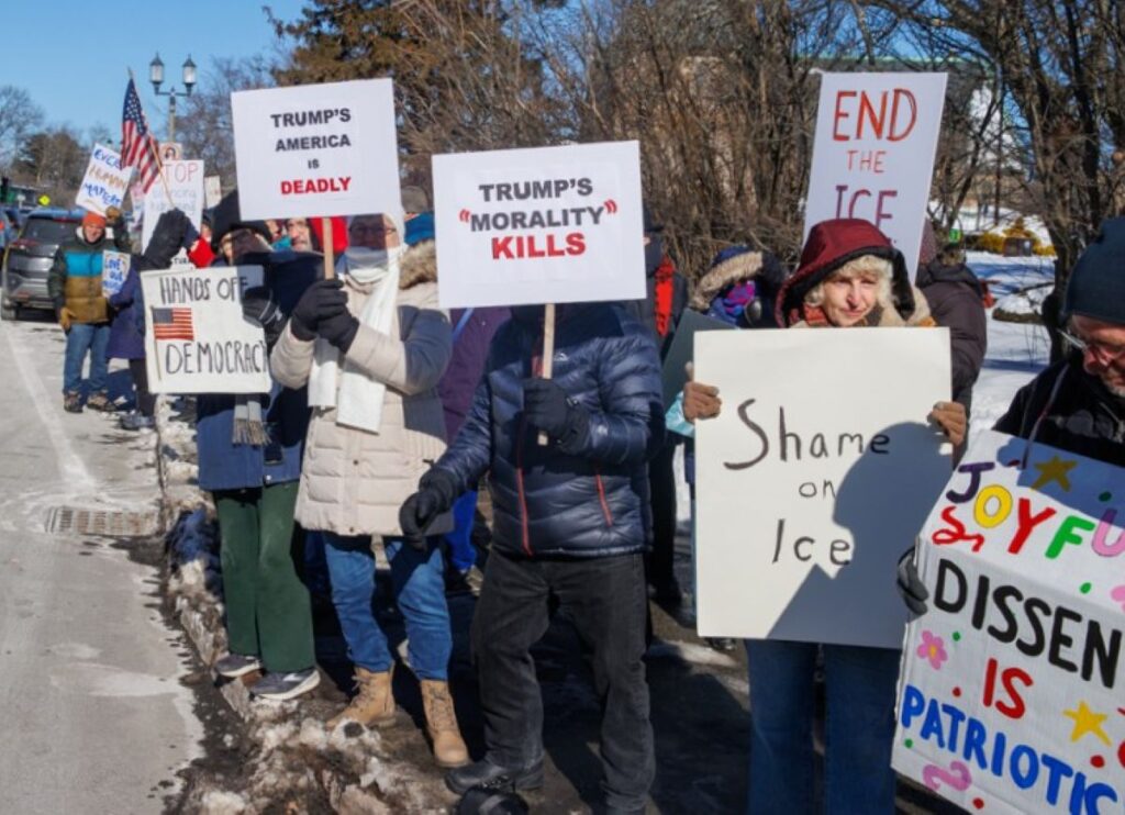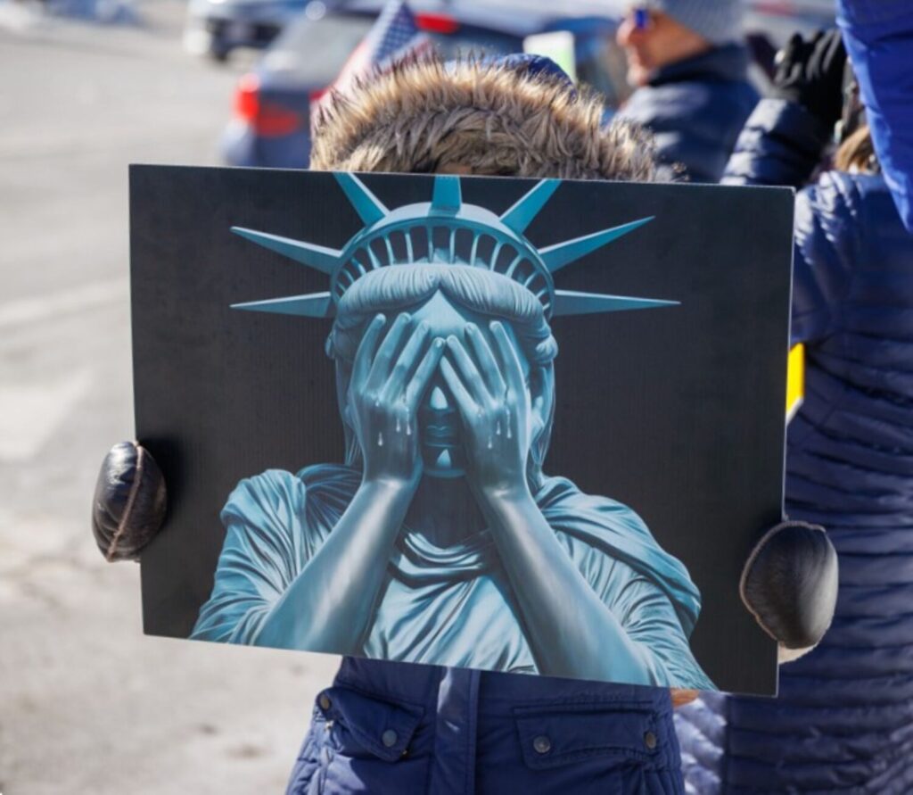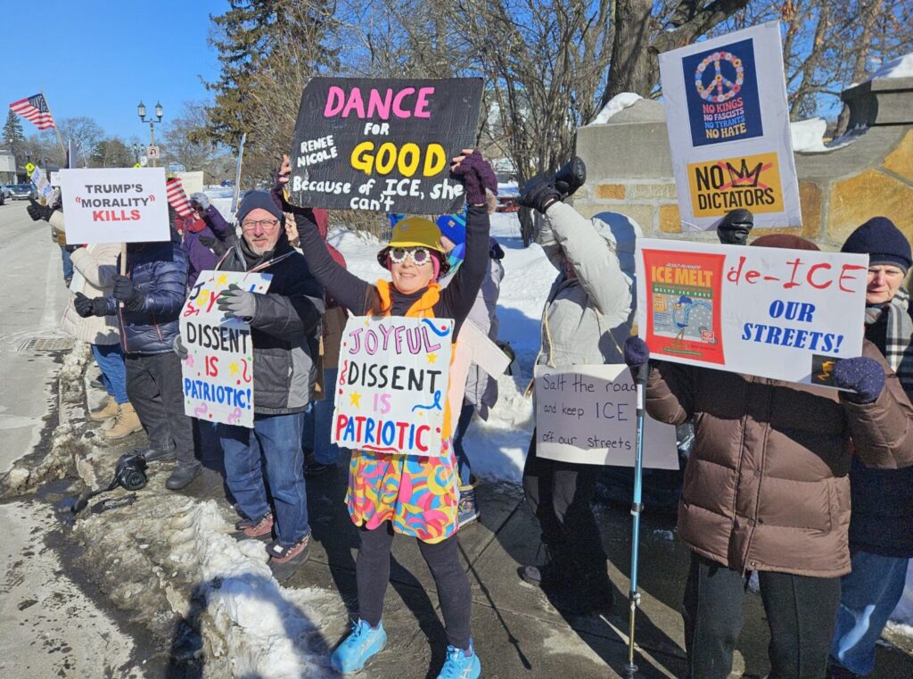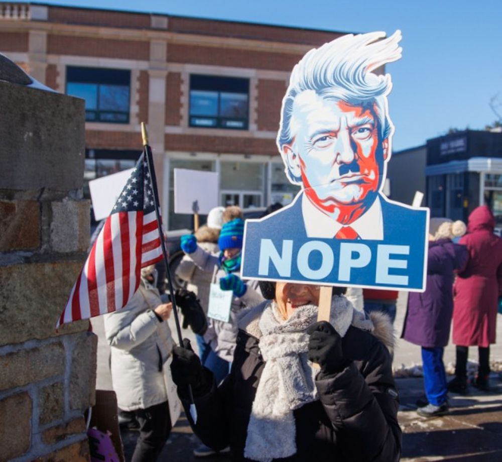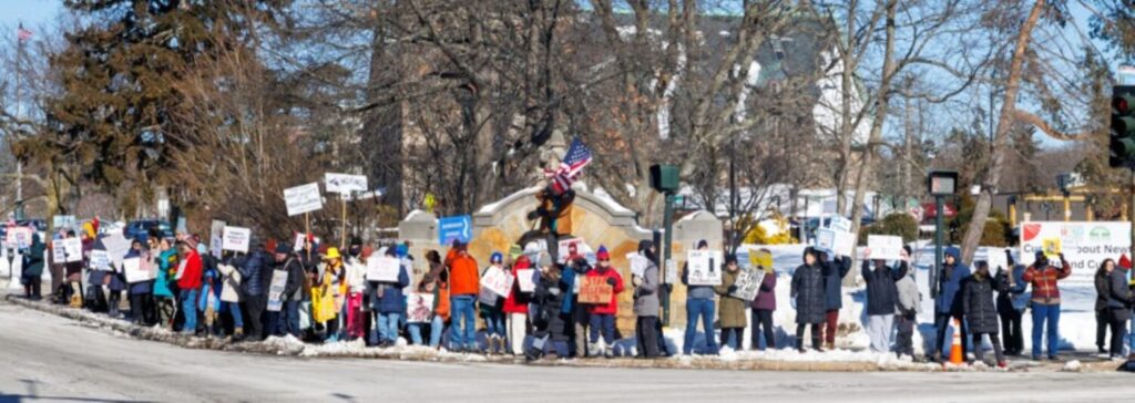At noon on Saturday, January 31, despite 14°F weather, 122 people gathered in Newton Centre for what has become a weekly protest against Trump administration policies. People lined the sidewalks around all sides of the Centre Street / Beacon Street intersection. They held signs, danced, and chanted — and were buoyed by vehicles honking in support. From the southwest corner, a woman with a megaphone provided an amplified recitation of the Declaration of Independence.