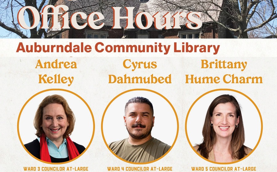 Three Councilors at Large — Andrea Kelley (Wd 3), Cyrus Dahmubed (Wd 4), and Brittany Hume Charm (Wd 5) — will hold joint office hours on Friday, March 6, 2PM-3PM at the Auburndale Community Library (375 Auburn Street, Auburndale). Bring your thoughts and questions, and the Councilors will bring some light refreshments!  RSVP here.