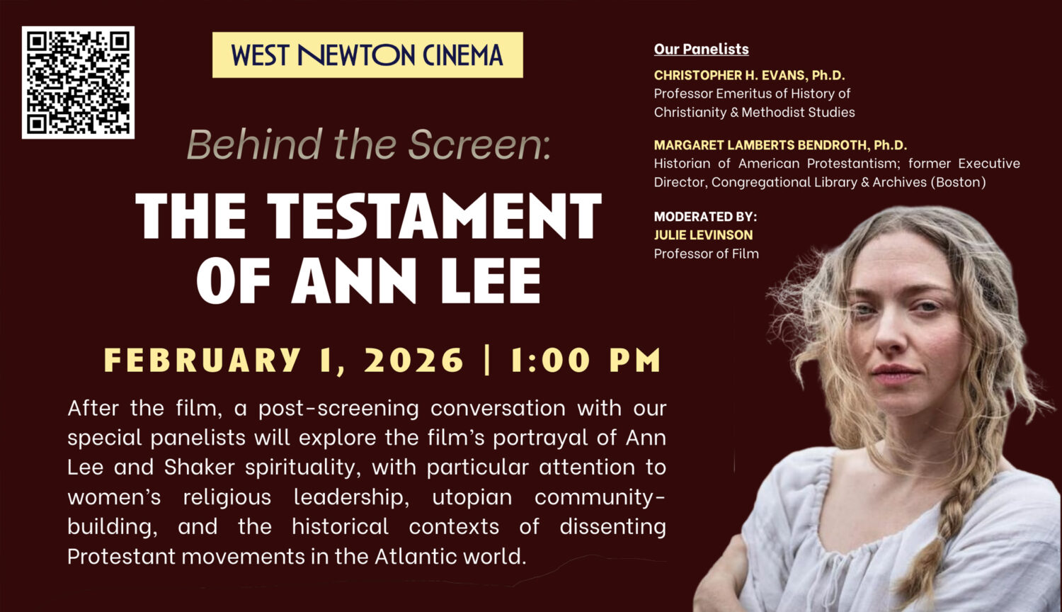 A post-screening conversation will explore the film’s portrayal of Ann Lee and Shaker spirituality, with particular attention to women’s religious leadership, utopian community-building, and the historical contexts of dissenting Protestant movements in the Atlantic world.