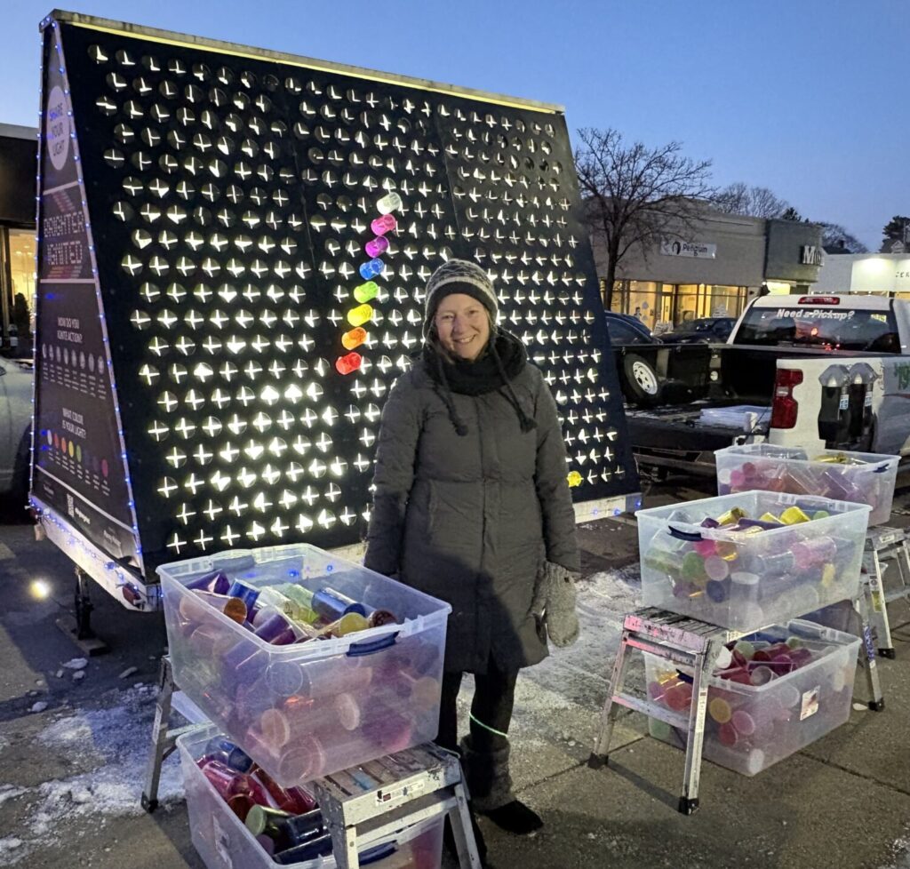 “Brighter Ignited,” the large art installation located closer to Centre Street, was created by Needham resident Tova Speter. The art therapist and educator said her love of Lite Brite — the 1960s battery-operated lightbox — helped her come up with the idea.