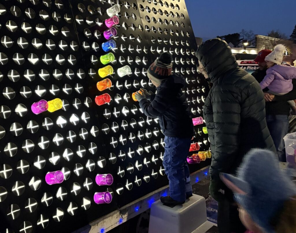 Children and parents at WinterFEST enjoyed inserting the colorful pegs into the holes to create a lit-up pattern right on Centre Street.