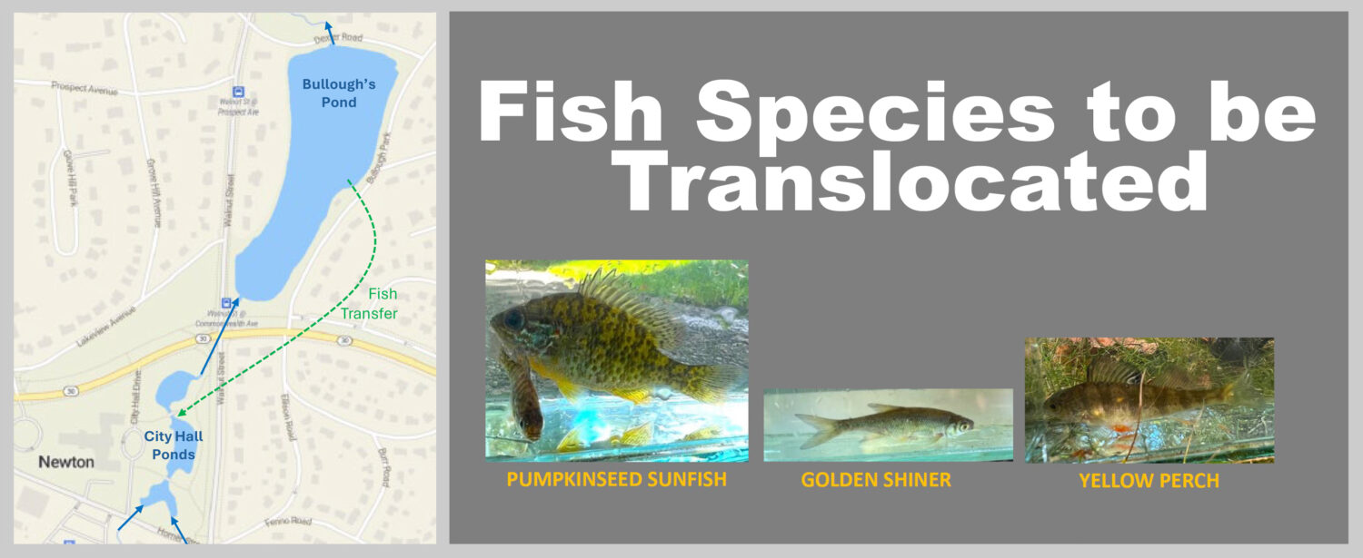 In 2024, the City of Newton initiated a De-Watering for Sediment Removal Project that resulted in fish in the City Hall Ponds being pumped into Bullough’s Pond. A press release from the City at the time said that the project would “reestablish the ponds’ capacity and maintain the aesthetic and passive recreational values of the ponds.”