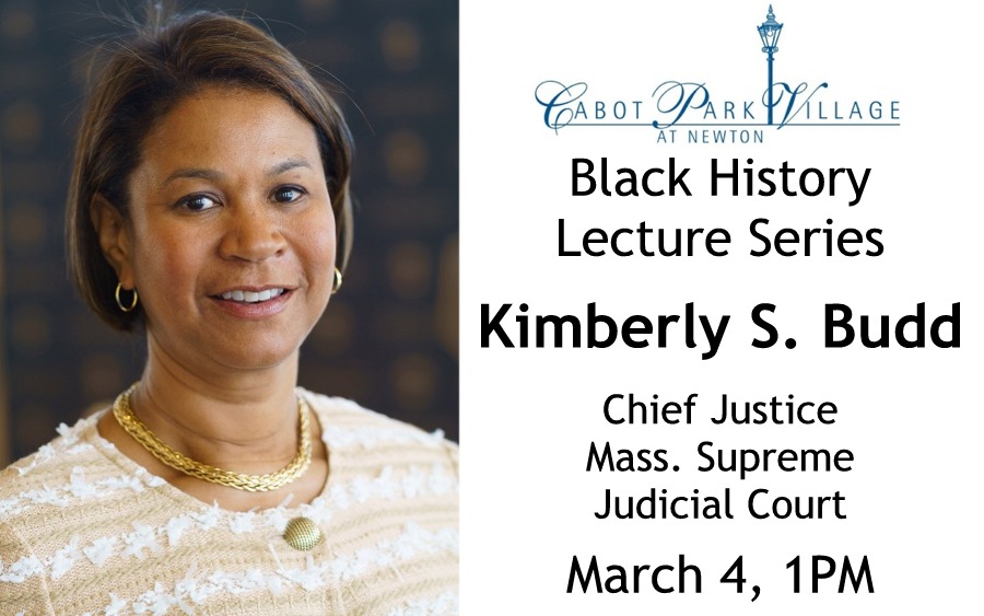 Massachusetts Supreme Judicial Court Chief Justice Kimberly S. Budd will speak in Cabot Park Village’s Black History Lecture Series on Wednesday, March 4 at 1PM in the Community Room of Cabot Park Village (280 Newtonville Avenue, Newtonville).