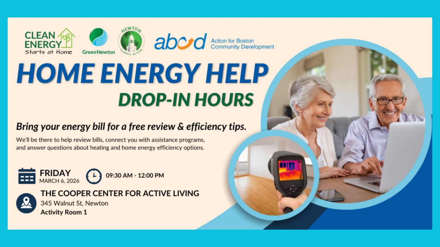 A free, friendly “drop-in” clinic on Friday, March 6 from 9:30AM – 12PM at the Cooper Center (345 Walnut Street, Newtonville) will offers answers to questions about utility bills and heating costs. No technical knowledge is required, and there is no pressure to sign up for anything — just clear, unbiased help from local experts.