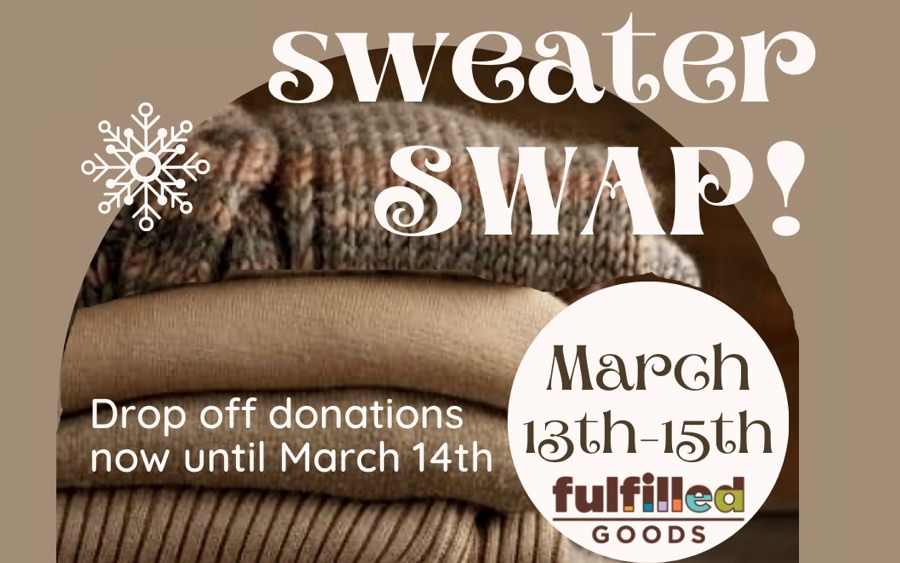 Fulfilled Goods will hold its second annual “sweater swap” from Friday-Saturday, March 13-15. All are invited to stop by to drop off sweaters at either location during store hours anytime before the swap. Sweaters must be in like-new condition with no stains or holes. Due to space limitations, only adult sizes will be accepted and please limit donations to 4 sweaters.