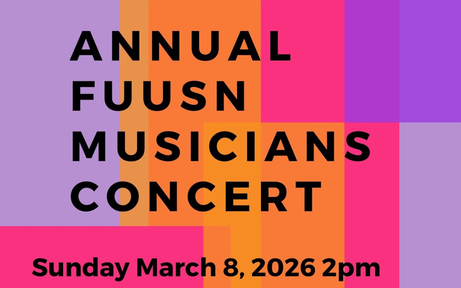 Come and hear the wonderful musicians of the First Unitarian Universalist Society (FUUSN) in concert on Sunday, March 8, 2026 at 2PM in the FUUSN Sanctuary (1326 Washington Street, West Newton).