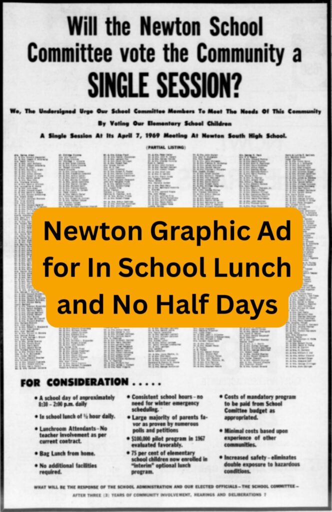 The lunch issue was resolved at an April 1969 School Committee meeting, so crowded with “orderly, but angry parents” that it had to be moved to a nearby school auditorium. After three hours of debate – most of it behind closed doors in an executive session while the crowd of parents waited outside – a compromise was reached. Elementary schools would have an opt-in, five-day-a-week, half-hour school lunch, paid for by those who chose it. Tuesdays and Thursdays would remain half days from 8:15AM to 12:30PM.
