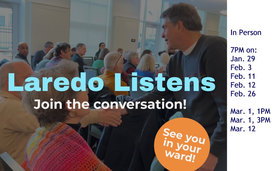 Mayor Marc Laredo is holding a series of Laredo Listens listening sessions throughout the city. Residents are invited to attend any of them, and registration is optional and encouraged in case the Mayor’s Office needs to change to a virtual meeting at the last minute due to weather conditions. For more information, email [email protected].