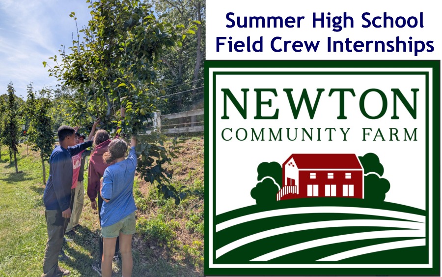 Newton Community Farm (NCF) is now accepting applications for its Summer High School Field Crew Internship Program! NCF field interns are crucial members of the farm team during the summer. Interns gain hand-on experience with all kinds of farm work including planting, harvesting, and packing produce while learning about our greater food system. The internship lasts 4 weeks, working on Tuesdays, Wednesdays, and Thursdays mornings. Learn more and apply on the farm’s website: https://www.newtoncommunityfarm.org/hs-internship-program