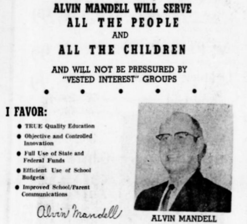 In 1973, Mandell was the top vote-getter on the School Committee (11,670 votes). He ran unopposed and was endorsed by the Newton Graphic: “Alvin Mandell appears to be the outstanding member of the committee. He knows exactly what the School Committee function really is.”