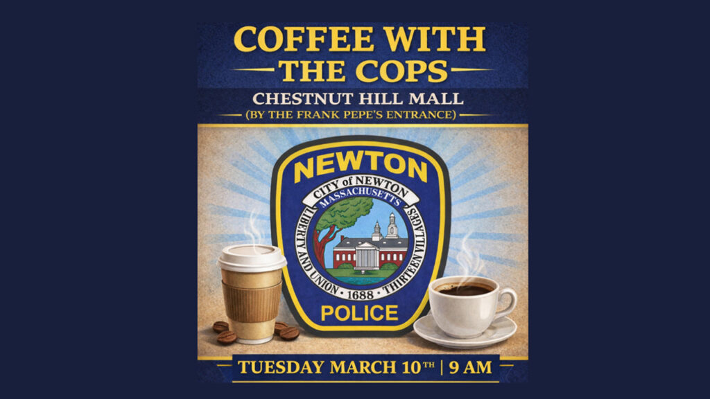 Join Newton police officers for coffee and conversation on Tuesday, March 10 at 9AM at The Chestnut Hill Mall at the Frank Pepe entrance.