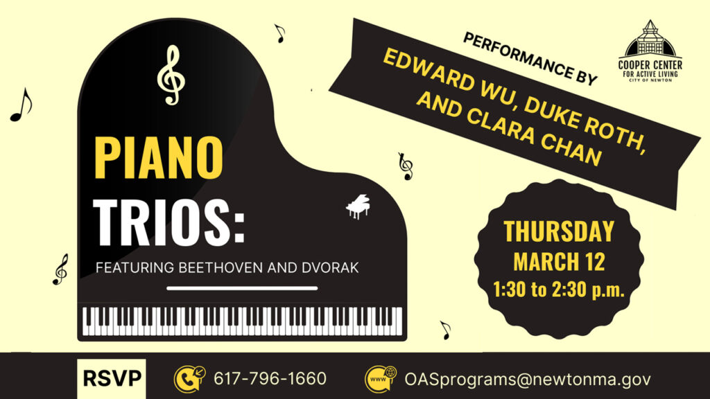 Violinist Edward Wu, cellist Duke Roth, and pianist Clara Chan will present romantic piano trio music by Beethoven and Dvorak on Thursday, March 12 from 1:30-2:30PM at the Cooper Center (345 Walnut Street, Newtonville). The pieces performed will be Beethoven Piano Trio Op. 70 No. 2 in E-flat Major and…