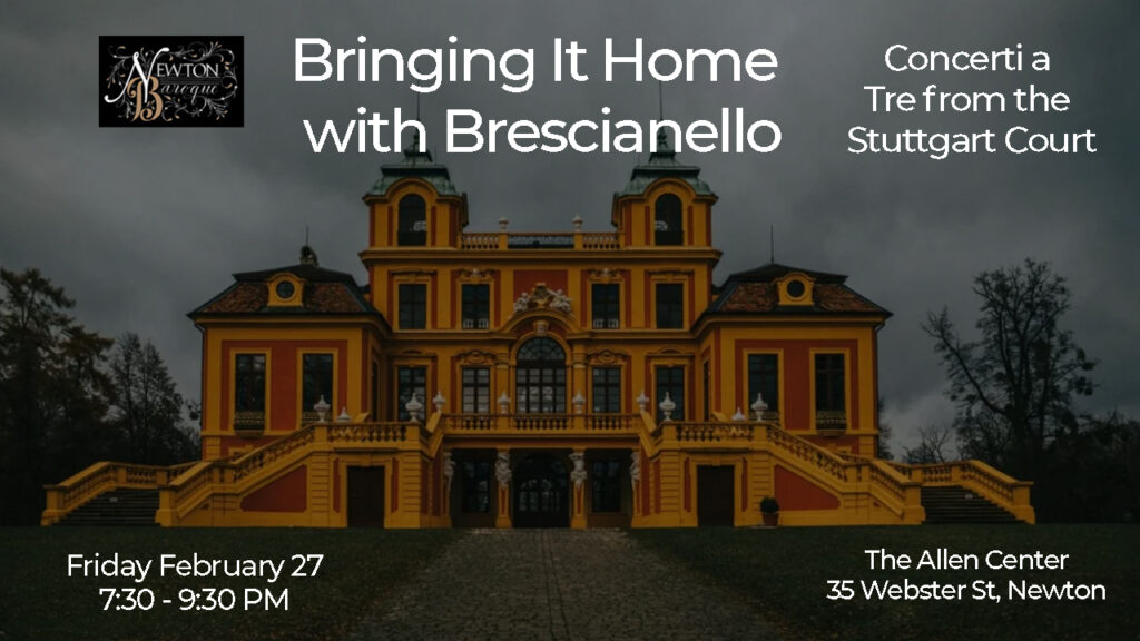 Newton Baroque presents Bringing It Home with Brescianello: Concerti a Tre from the Stuttgart Court at The Allen Center (35 Webster Street, West Newton). Purchase tickets for Friday, February 27 or Saturday, February 28. The concert starts at 7:30PM.