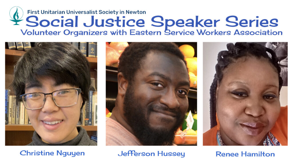 The First Unitarian Universalist Society of Newton’s (FUUSN) Social Justice Speakers Task Force is holding a discussion with Christine Nguyen, Jefferson Hussey, and Renee Hamilton, volunteer organizers with the Eastern Service Workers Association (ESWA), on Sunday, February 22 at 12PM in the FUUSN Alliance Room (1326 Washington Street, West Newton). ESWA is an all-volunteer association of…