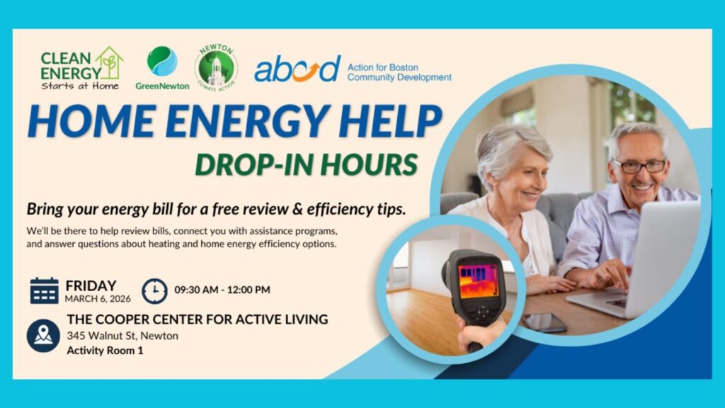 A free, friendly “drop-in” clinic on Friday, March 6 from 9:30AM – 12PM at the Cooper Center (345 Walnut Street, Newtonville) will offers answers to questions about utility bills and heating costs. No technical knowledge is required, and there is no pressure to sign up for anything — just clear, unbiased…