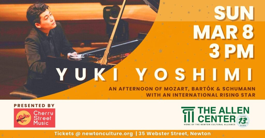 As part of the Cherry Street Music concert series, 25-year-old piano sensation Yuki Yoshimi takes the stage at The Allen Center (35 Webster Street, West Newton) on Sunday, March 8 at 3PM for an unforgettable evening of Mozart, Bartók, and Schumann. Tickets are $30-$60. Yoshimi captured international attention when he became the youngest-ever winner…