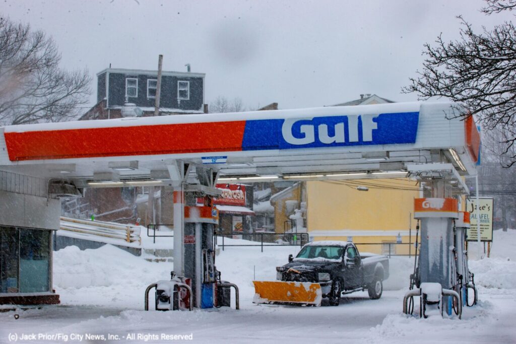 George Audi drove into Newton at 6AM to open the Newton Center Gulf Station for the day to fuel plows and first responders. He reported visibility at that hour on Route 128 “was zero.”