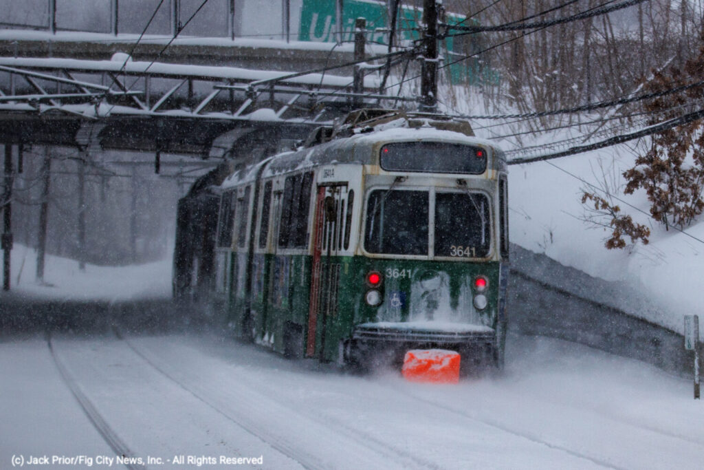The MBTA Green Line continued to operate throughout the storm, with snow up to the train entrance doors. A Brigham and Women’s Hospital Doctor boarded the train mid-day for his shift.