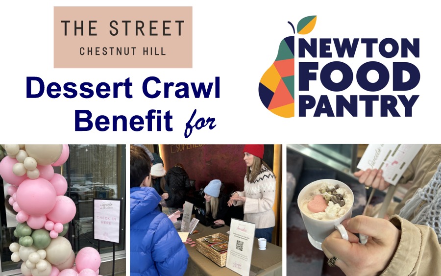 Dozens of residents braved a New England snowstorm Feb. 7 to enjoy a Chestnut Hill dessert crawl benefitting the Newton Food Pantry. They walked a route spanning The Street shopping center, sheltering from the snow in sweetly-scented stores along the way.