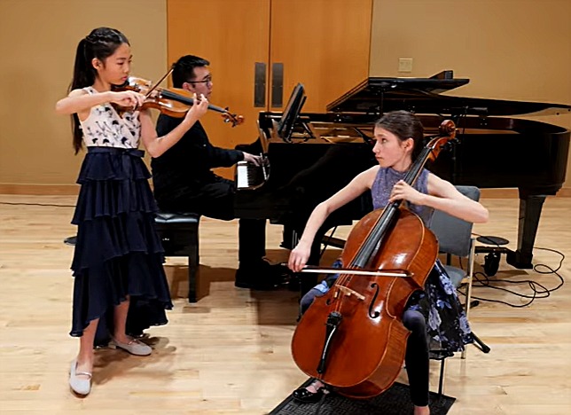 Valerie Bai (left) and Sofia Hernandez-Williams (right) play a preview of the Double Concerto with piano accompanist Yandi Chen (center) in preparation for their concert on February 28. (courtesy photo)