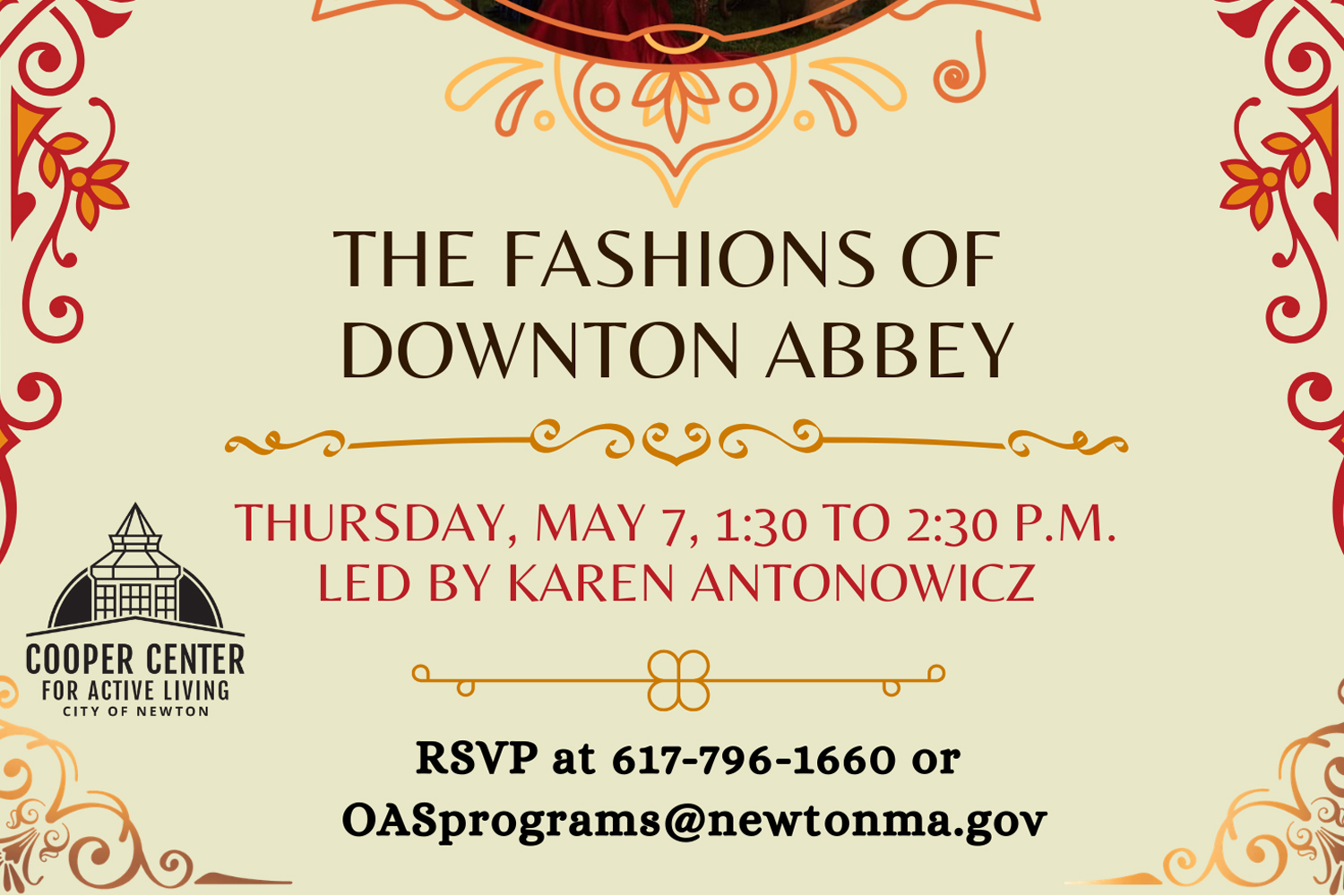 Would you love to know more about the fashion in Downton Abbey? If so, join Karen Antonowicz at the Cooper Center (345 Walnut Street, Newtonville) on Thursday, May 7 from 1:30-2:30PM.