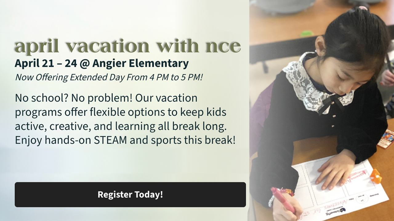 Newton Community Education’s April Vacation Programs at Angier Elementary School (1697 Beacon Street, Waban) offer engaging, hands-on experiences for children in grades K–8 during the week of April 21–24, with drop-off starting at 8:30 AM and extended day available until 5 PM.