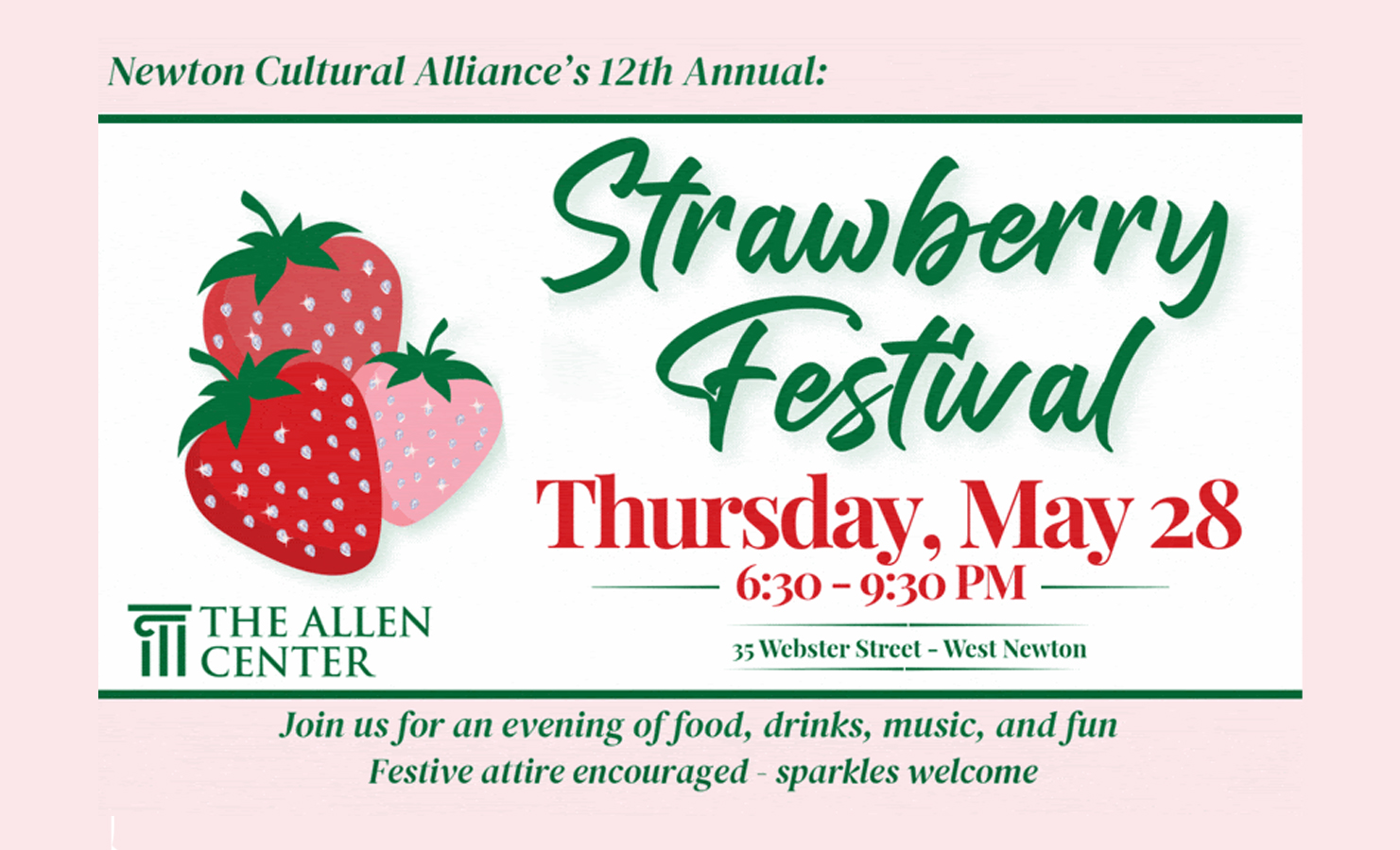 The Newton Cultural Alliance’s 12th annual Strawberry Festival will be on Thursday, May 28 from 6:30-9:30PM at The Allen Center (35 Webster Street, West Newton).