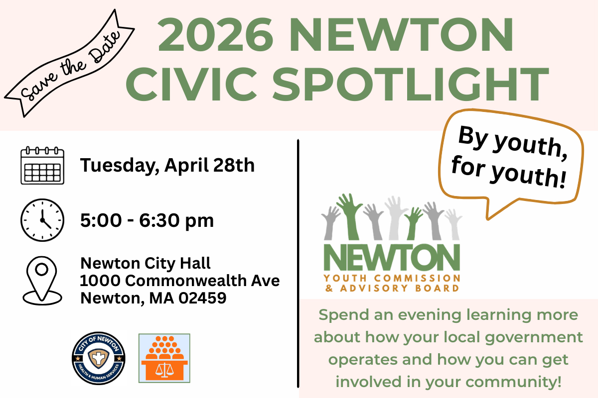 Join the Newton Youth Commission and Advisory Board at the 2026 Newton Civic Spotlight at City Hall (1000 Commonwealth Avenue, Newton Centre) on Tuesday, April 28, from 5–6:30PM.