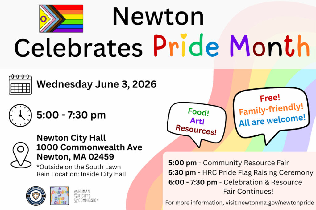 The Newton Human Rights Commission is pleased to partner this year with the Celebration of Queer Culture (CQC) Planning Committee to host a shared Pride Month event in Newton on Wednesday, June 3 at 5-7:30PM at Newton City Hall (1000 Commonwealth Ave, Newton Centre). Free and open to all. That first gathering…